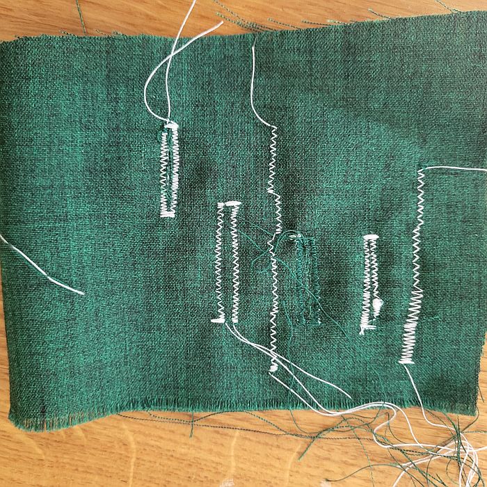 Meine Probe-Knopflöcher für meine Probe-Hose. Seit Wochen liegt sie anklagend auf dem Stuhl und heute soll sie fertig werden. Sie wurde auch fertig. Aber sie passt nicht wirklich gut. So ein FRUST!!!! Heute mache ich jedenfalls nichts mehr damit. (Obwohl das Knopfloch wirklich gut geworden ist).