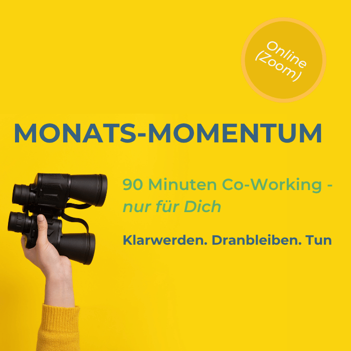 Hand, die ein Fernglas hochhält mit Schrift "Monats-Momentum 90 Minuten Co-Working"